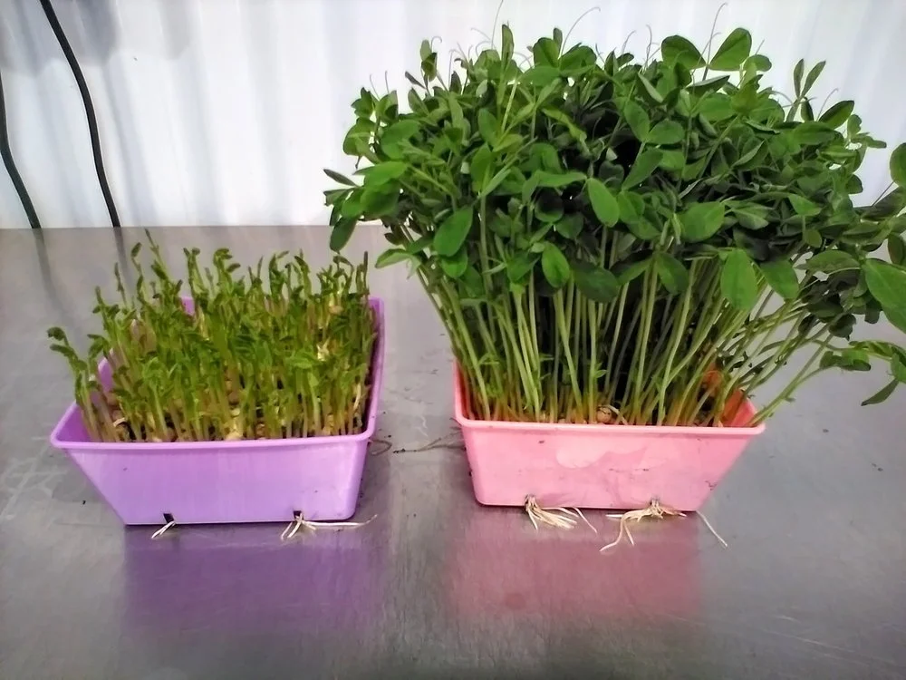 pea shoots coming out of darkness and pea shoots ready to eat